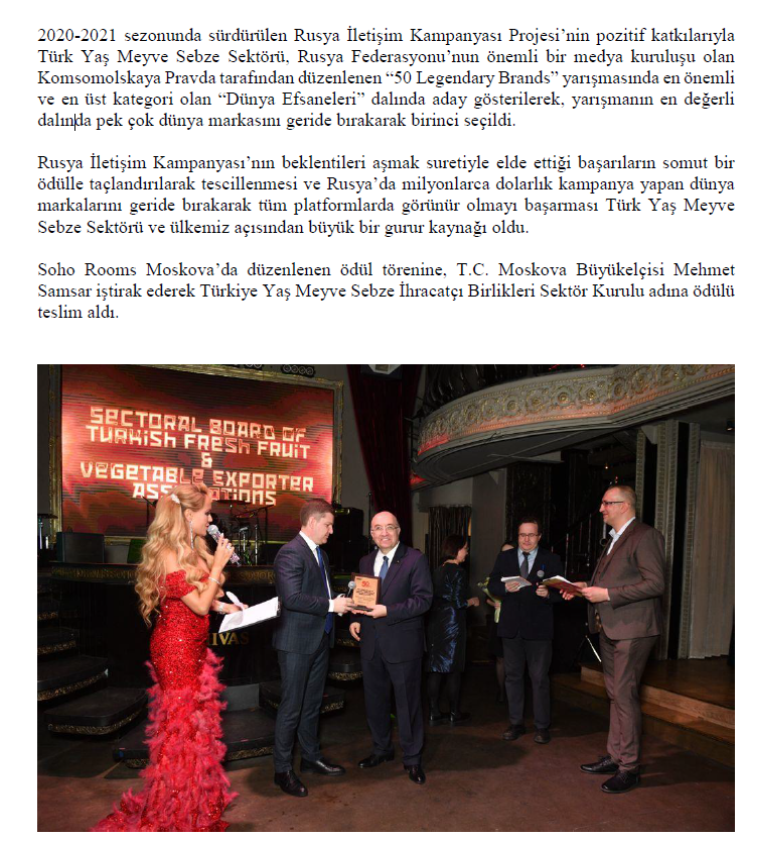 Yaş Meyve Sebze Sektör Kurulunun Çalışmaları Rusya’da Ödülle Taçlandırıldı